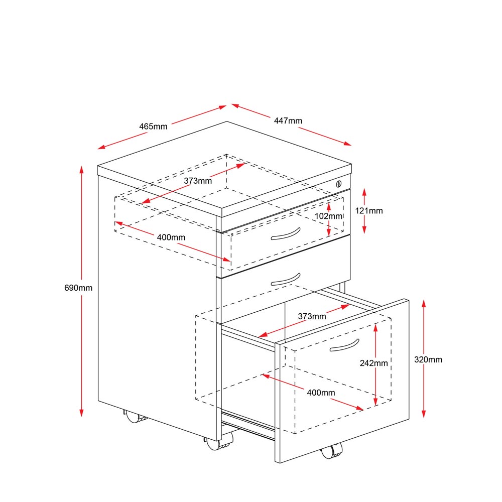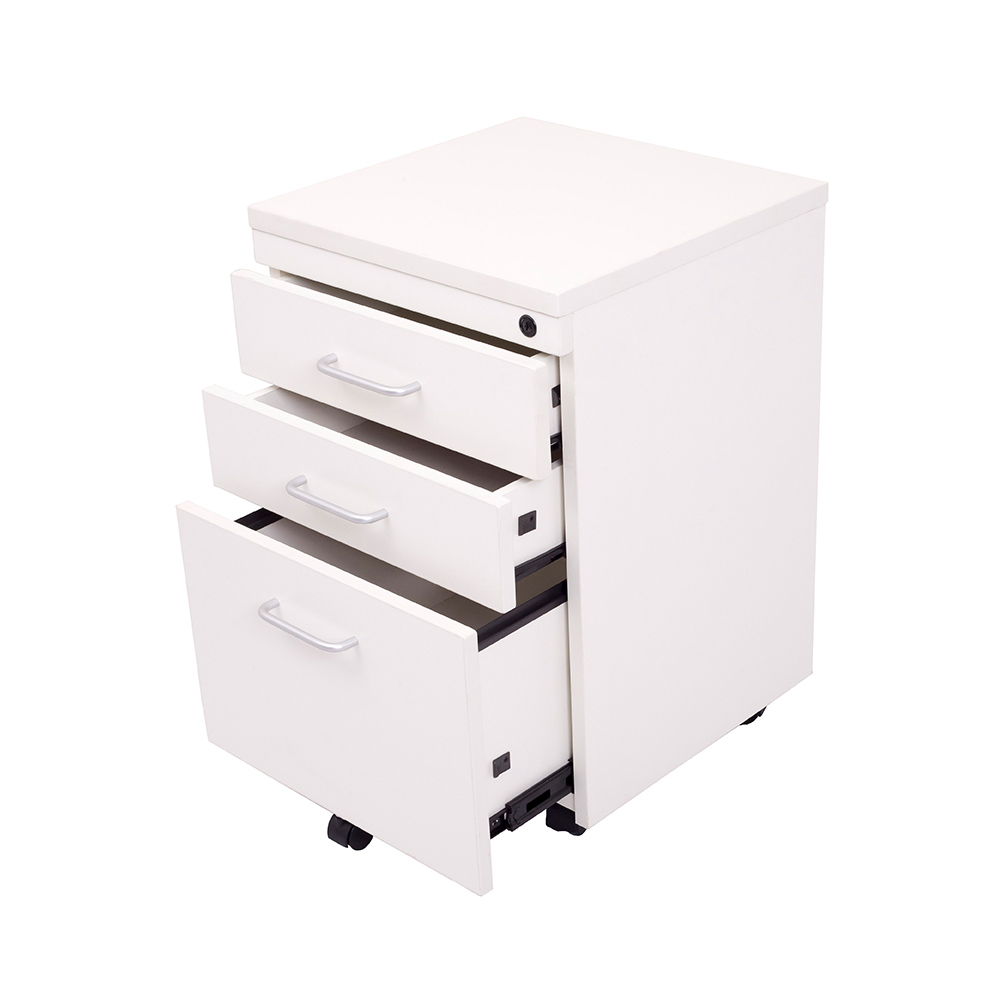 Store your office equipment with the stylish and durable Rapid Span 3 Drawer Mobile Pedestal. Featuring a strong E1 rated 25mm melamine construction, this pedestal is designed to withstand heavy office usage with ease. It features three spacious drawers on metal runners: two standard personal drawers and one file drawer. This pedestal moves on five heavy duty castors, giving you complete office flexibility and stability. With a master locking system and two keys, you can keep your office items safe and private. Complete your office storage today with the Rapid Span 3 Drawer Mobile Pedestal!