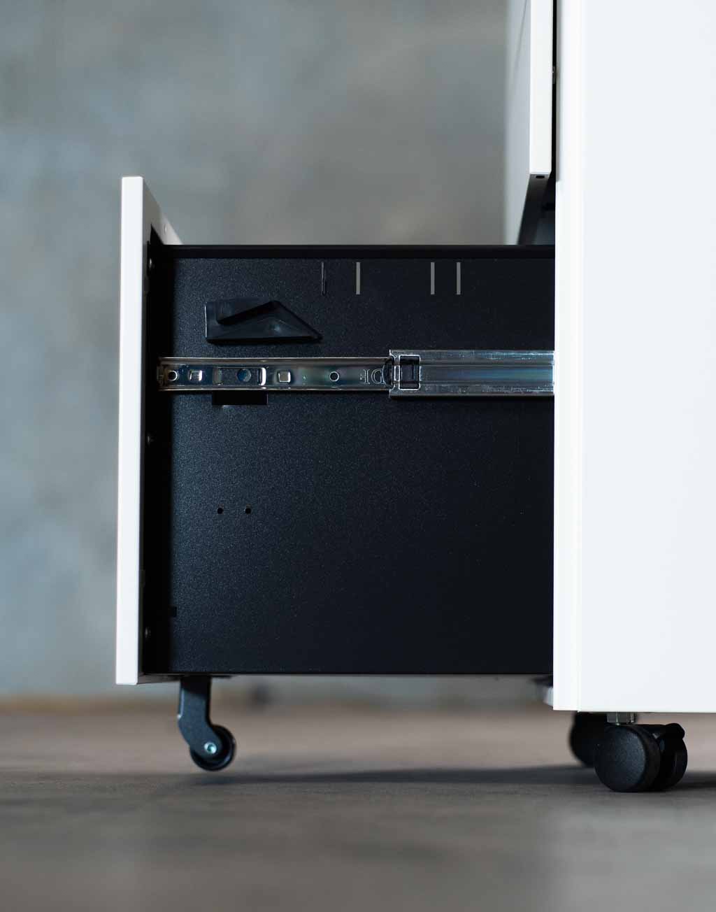 The Signature Steel Mobile Pedestal is a flexible, durable and affordable office storage solution. With 2 spacious personal drawers, 1 sideways file drawer and a handy pen tray, you’ll have less clutter on your desk and more leg room in no time! Built tough with heavy duty steel, this pedestal is the perfect mix of sturdy and portable, with an extra castor wheel on the file draw for added movability. Get peace of mind with the added security of a key lock to keep your files and personal items safe. Available in two stylish colours (black or white powdercoat), the Signature Steel Mobile Pedestal arrives fully assembled and is backed by a massive 10-year warranty.