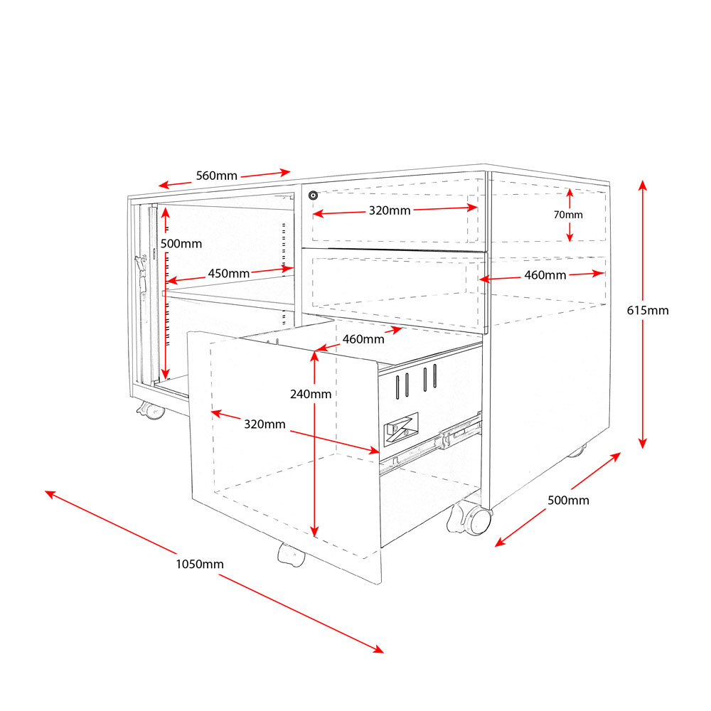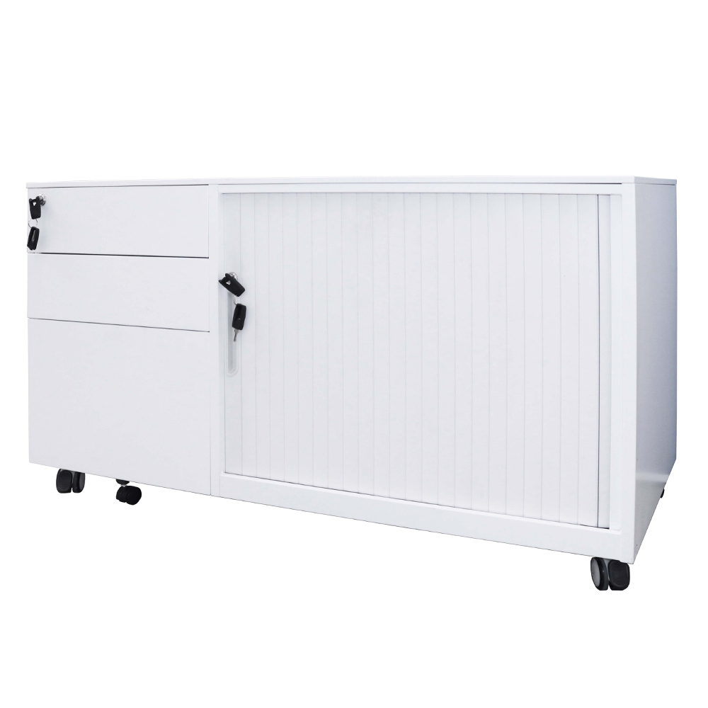 The Steel Mobile Caddy is a versatile and practical storage option for the workplace. It features a file drawer plus two standard drawers, and a shelved storage space with a sliding tambour door. The durable steel construction sits atop four lockable castors with one extra at the base of the file drawer for added stability. The long lasting quality of this unit is supported by the use of ball bearing runners and heavy duty hard floor castors.