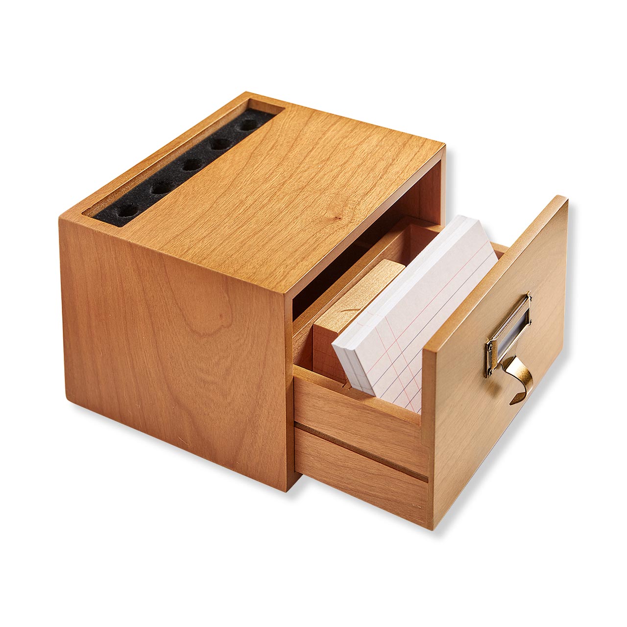Bearing an uncanny resemblance to the familiar catalog drawers found in the libraries of an era now past, this 3 x 5 index card box and pen stand makes a distinctive and useful desk accessory for book lovers and note-takers. Pull the antique brass handle to open the drawer, where you can stash the 50 included ruled . Store up to five pens in back, and use the included mini card block for stand-up notes and reminders.