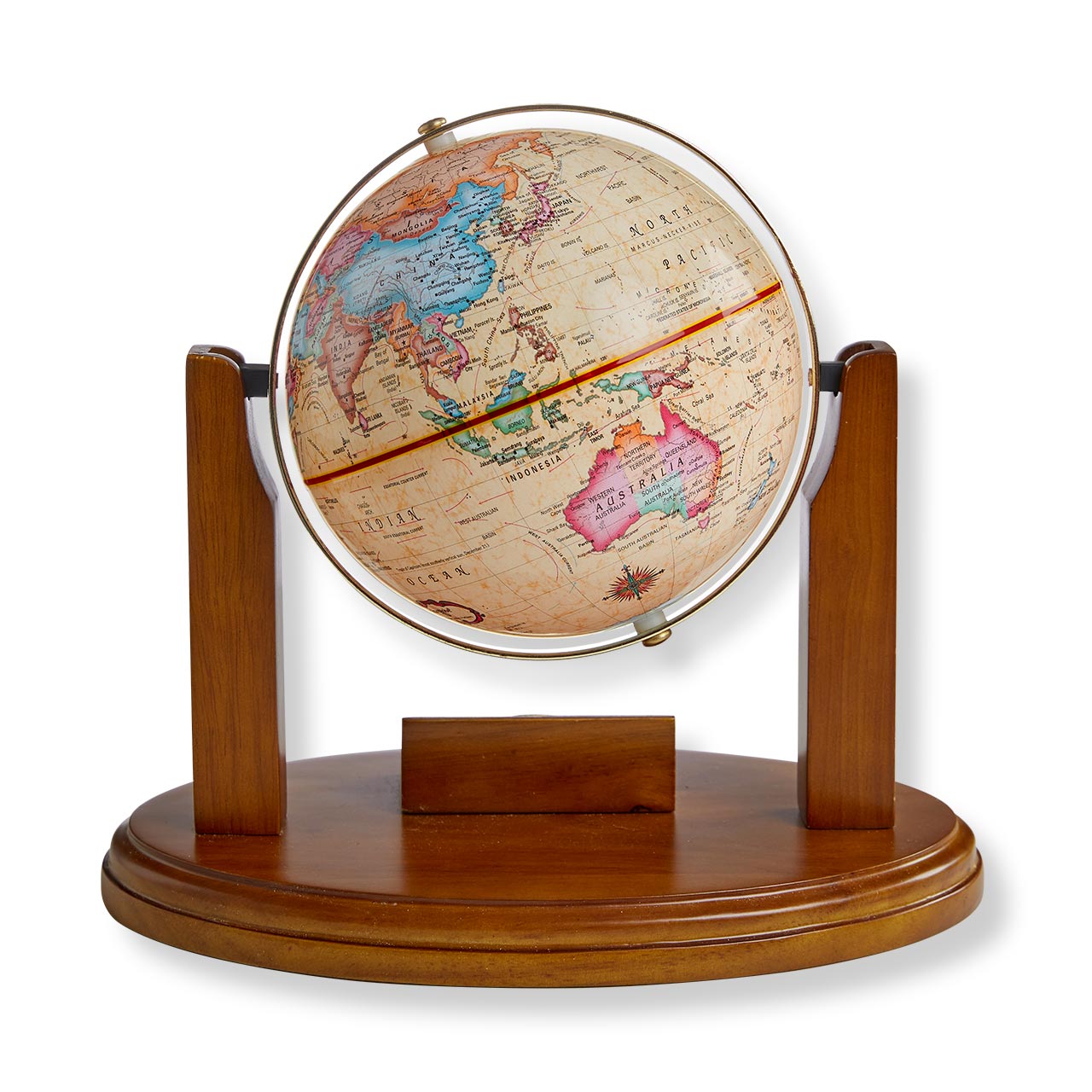 From the world-renowned Replogle globe makers of Chicago comes this unique table and desk clock that keeps the world at your fingertips. Featuring up-to-date cartography from January 2023, the handmade mini globe (made in the USA) is mounted on a solid hardwood base above the Gyro-Matic Meridian quartz clock.